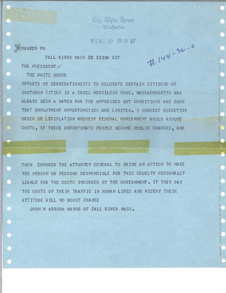 For example, John M. Arruda, mayor of Fall River, Massachusetts wrote to President Kennedy: