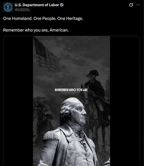 — The US Department of Labor posting an image of George Washington with the words: “One Homeland. One People. One Heritage,” an eerie echo of “Ein Volk, ein Reich, ein Führer (One People, One Nation, One Leader).