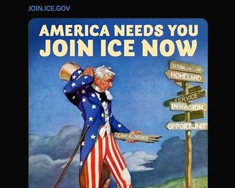 “The increase in white nationalist content [from ICE] appears to originate with a June 11, 2025 post. That day, DHS’ official X and Instagram accounts posted a graphic of Uncle Sam hammering up a sign with the caption: “Help your country … and yourself … REPORT ALL FOREIGN INVADERS.” A hotline number for ICE accompanied the post.