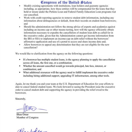 Representative Ilhan Omar (D-MN) along with 55 colleagues just sent a letter to Education Secretary Miguel Cardona requesting both details and rapid action on President Biden’s campaign promise to forgive student debt in America.