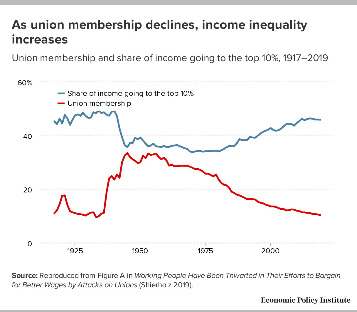 In a little over a decade, America went from about a third of its workers being represented by a union to around 10%. As a result, wages collapsed and the middle class began to slide into debt. Unions today only represent 6% of private-sector workers.