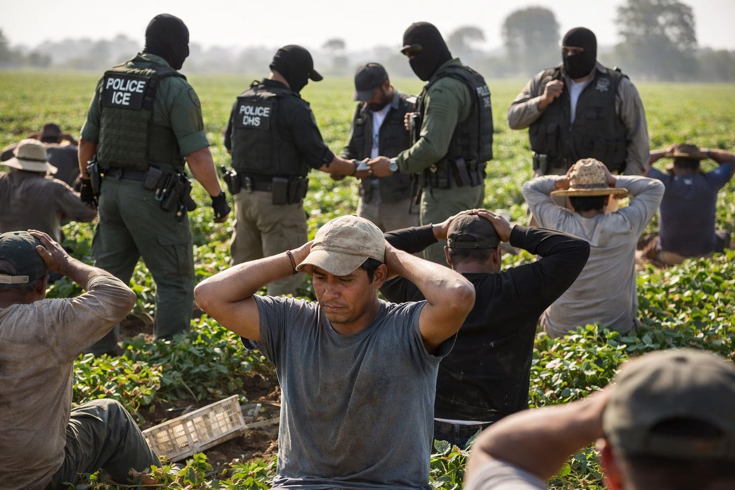 The picture Thom included is similar to ones I have seen of Nazi uniformed patrols demanding "Papieren bitte" (papers please). But in a farm field? Who carries ID to harvest crops? Moreover, who do these thugs think will harvest their veggies? butcher their meat? clean up their hotel room? Also, wearing masks makes it impossible to make a complaint regarding excessive force. That gives these ex-militia racist goons impunity.