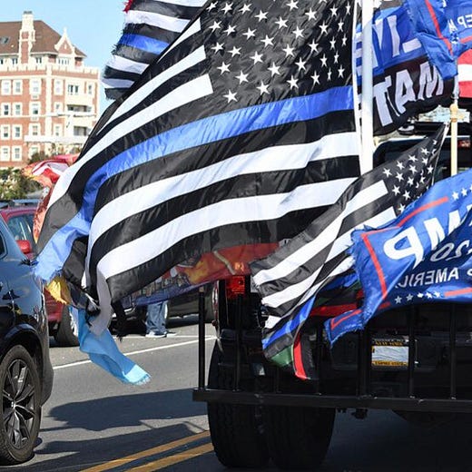 Republicans and their media lionize Kyle Rittenhouse for showing up at a Black Lives Matter protest and killing two protestors. They celebrate police violence with “thin blue line” flags, and wave the all-black US flag that signifies the willingness to kill one’s political opponents.