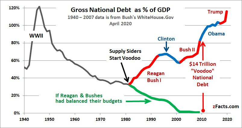 If you’re concerned about the national debt, the entire $30+ trillion of it can be attributed to four simple events: massive, multi-trillion-dollar tax cuts by Reagan, Bush, and Trump along with two unnecessary multi-trillion-dollar wars that George W. Bush lied us into.