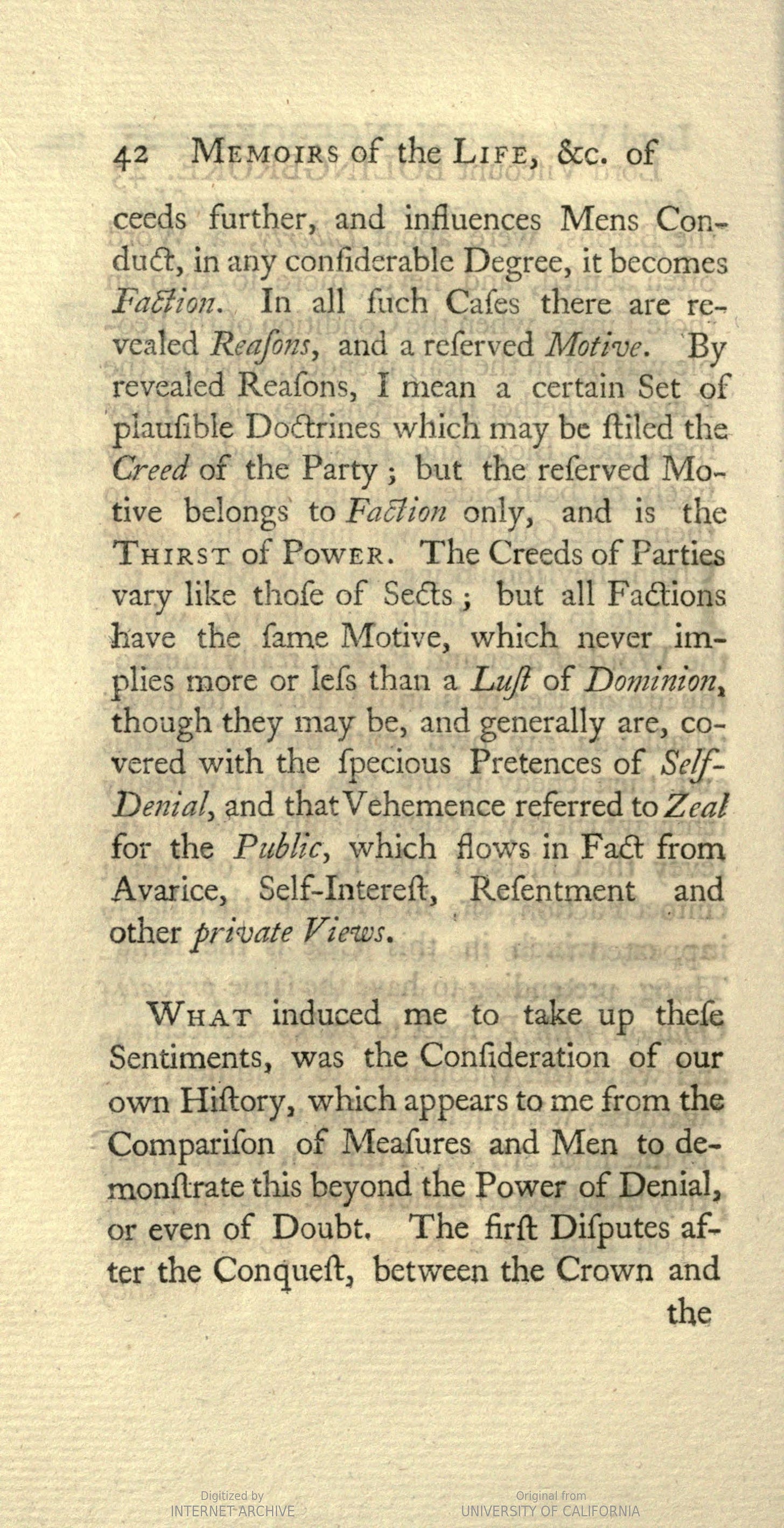 “In all such cases there are revealed reasons, and a reserved Motive. By revealed reasons, I mean a set of plausible doctrines, which may be styled [called] the creed of the party; but the reserved motive belongs to Faction only, and is the THIRST OF POWER. [emphasis Bolingbroke’s]