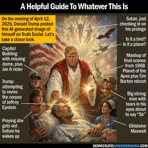 Sunday night, on Orthodox Easter, Donald Trump posted to his failing, Nazi-infested social media site an AI image of himself as Jesus, healing a man who looked suspiciously like Jeffrey Epstein as a woman who looked a lot like a young Ghislaine Maxwell looked on, with a horned demon overhead. Here’s the image annotated by the fine folks at Democratic Underground: