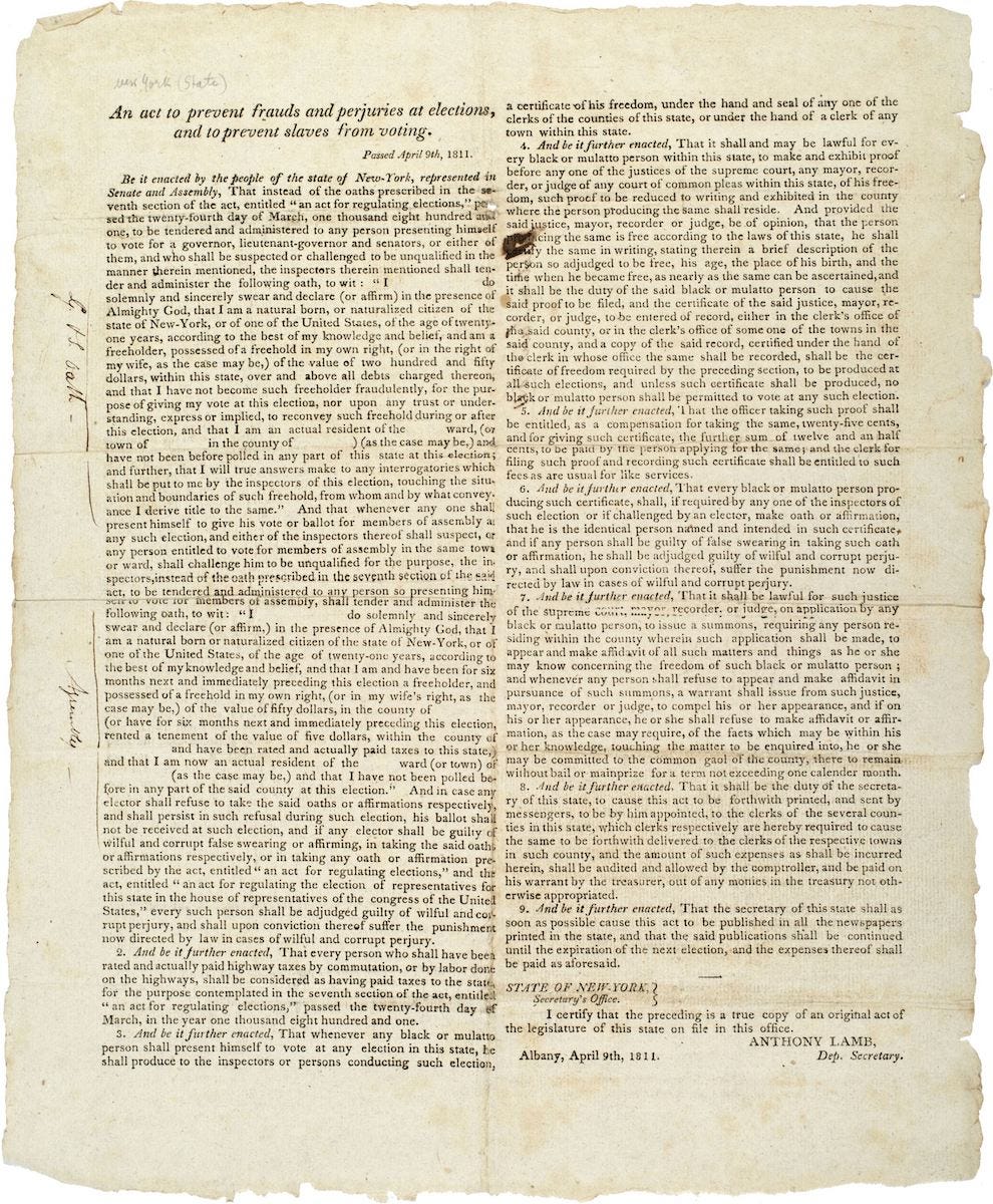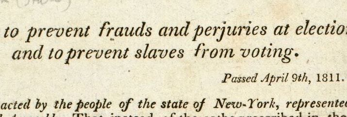 “Democratic-Republican inspectors at polling booths attempted to dissuade blacks from voting by harassing them for proof of their freedom. In 1811, the Democratic-Republican-dominated New York State legislature made such harassment legal by passing ‘[a]n Act to prevent frauds at election and slaves from voting.’”