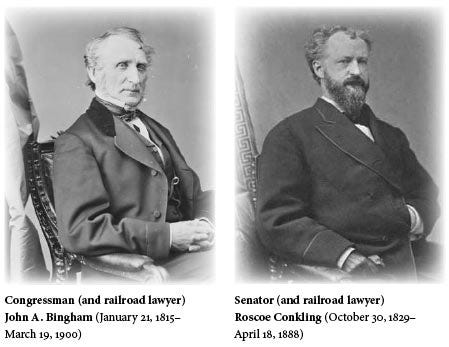 They fingered two Republicans: former senator (and railroad lawyer) Roscoe Conkling and former congressman (and railroad lawyer) John A. Bingham. The theory, in short, was that Conkling, when he was part of the Senate committee that wrote the Fourteenth Amendment back in 1868, had intentionally inserted the word person instead of the correct legal phrase natural person to describe who would get the protections of the amendment. Bingham similarly worked in the House of Representatives to get the language passed.