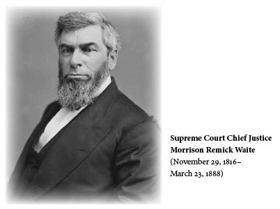 The chief justice had a square head with a wide slash of a mouth over a broomlike shock of bristly graying beard that shot out in every direction. A graduate of Yale University and formerly a lawyer out of Toledo, Ohio, Waite had specialized in defending railroads and large corporations.