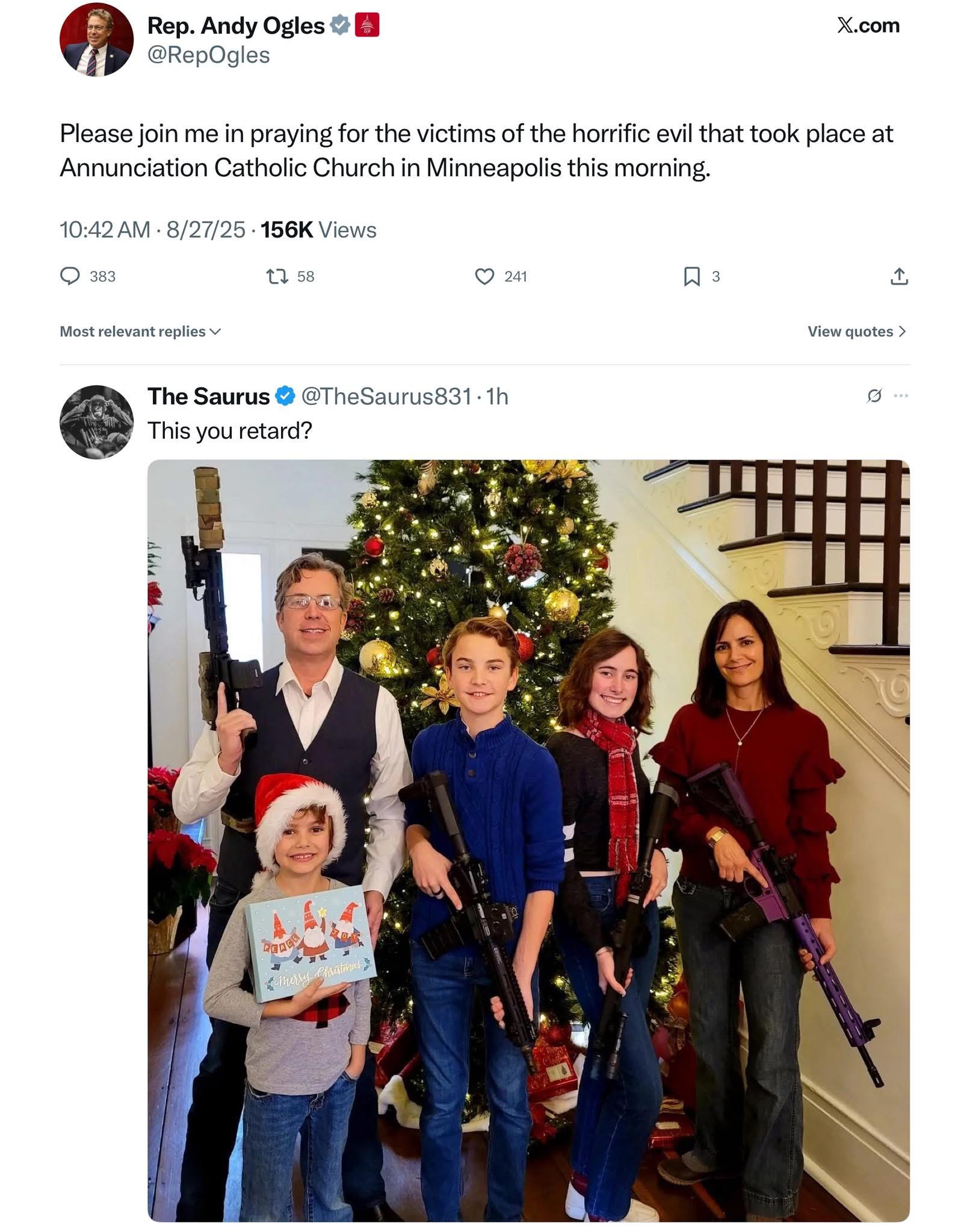 The greed embraced by Republican politicians — and the billionaires and CEOs who fund them — is why average Americans can’t have nice things. It’s why we and our children must walk the tightrope of life without the same safety net other countries — from Canada to Costa Rica, France to Taiwan — offer their citizens. It’s why children are dead today in Minneapolis as Republican politicians happily pocket NRA cash.