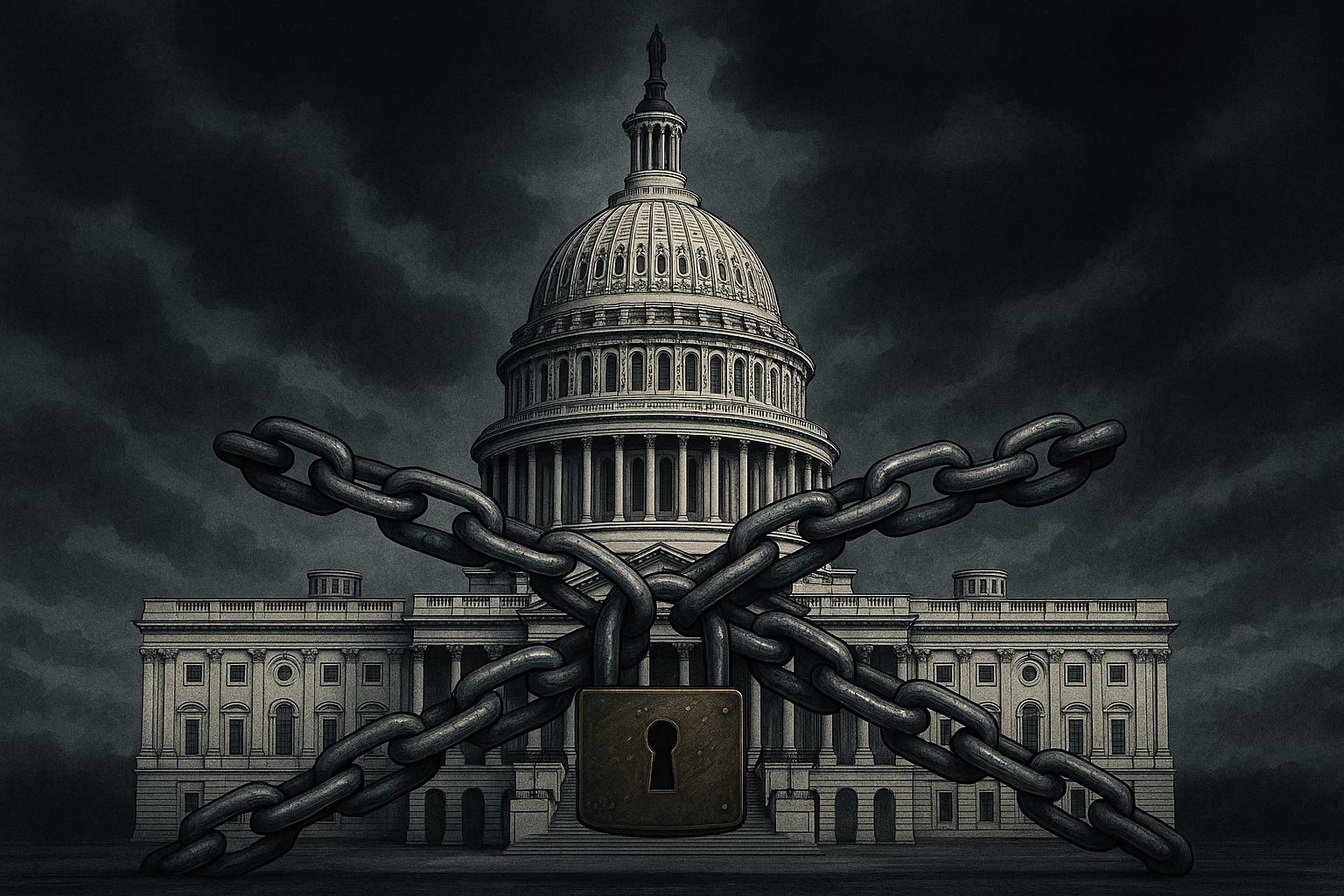 Chains on the Capitol, storm clouds in the sky
