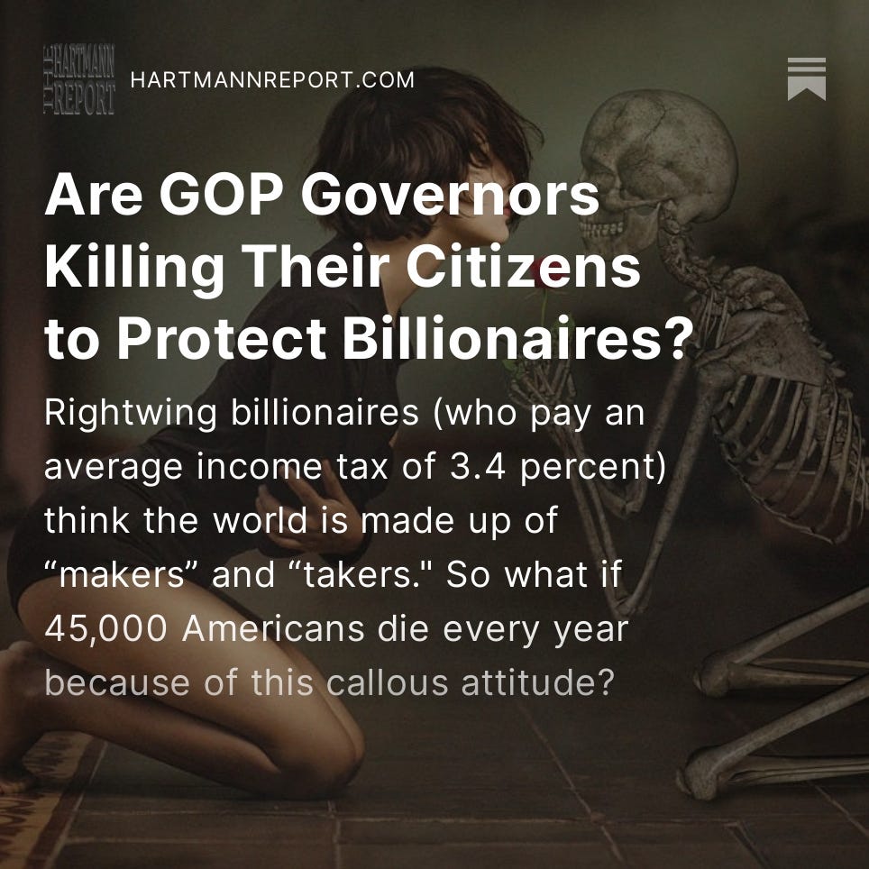 The Monday-Friday “Daily Take” articles are free for everybody; only the Podcast, Saturday News Report, the Sunday Book Excerpt and Ask Thom Anything require a paid subscription (although signing up helps us get the word out!).