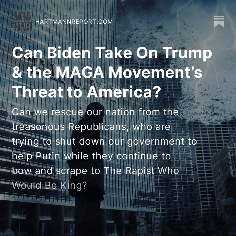 The Monday-Friday “Daily Take” articles are free for everybody; only the Podcast, Saturday News Report, the Sunday Book Excerpt and Ask Thom Anything require a paid subscription (although signing up helps us get the word out!).