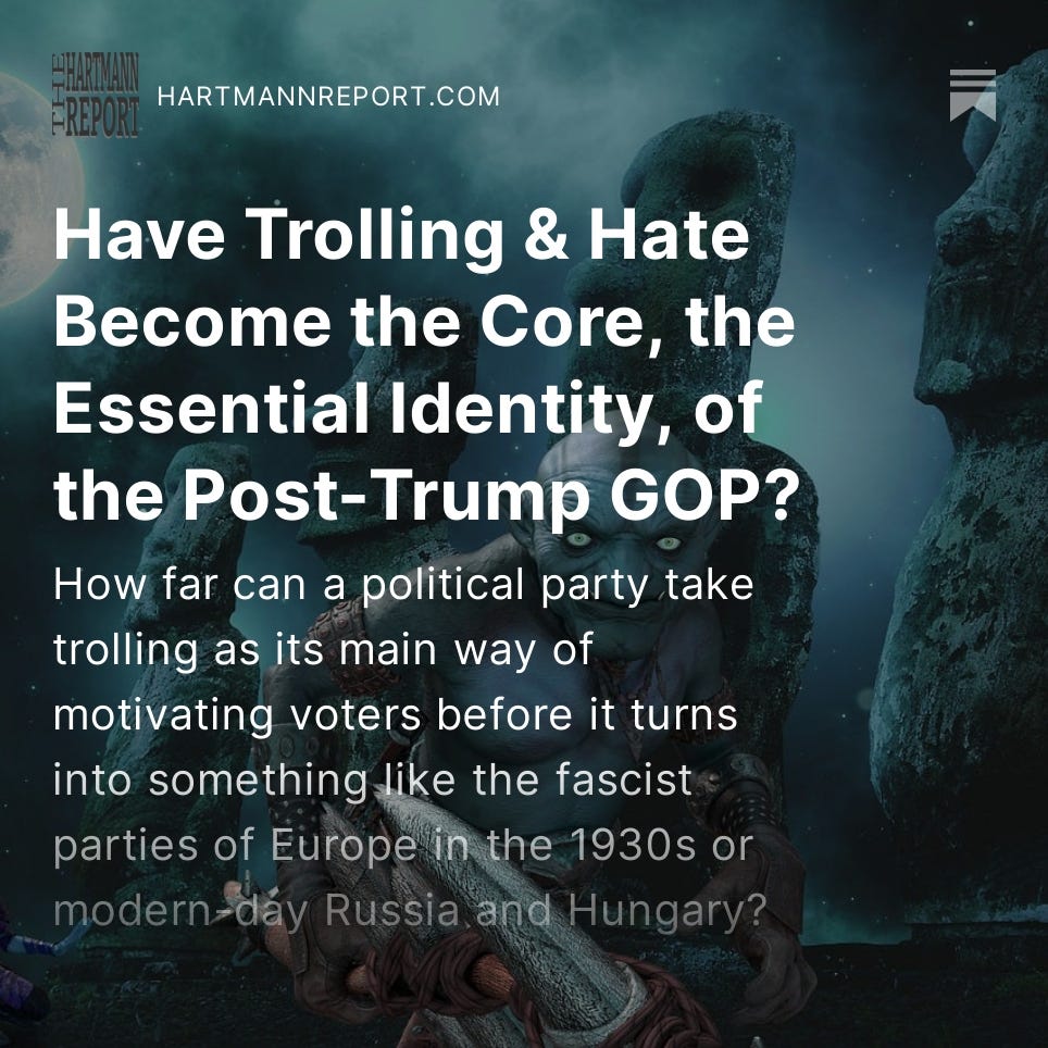 The Monday-Friday “Daily Take” articles are free for everybody; only the Podcast, Saturday News Report, the Sunday Book Excerpt and Ask Thom Anything require a paid subscription (although signing up helps us get the word out!).