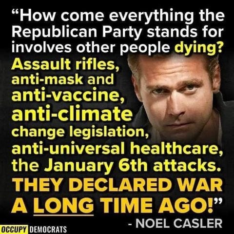 He then goes on to note GOP support for assault weapons, opposition to masks and vaccines, opposition to saving the environment, and their all-out war on Obamacare and Medicare-for-All.