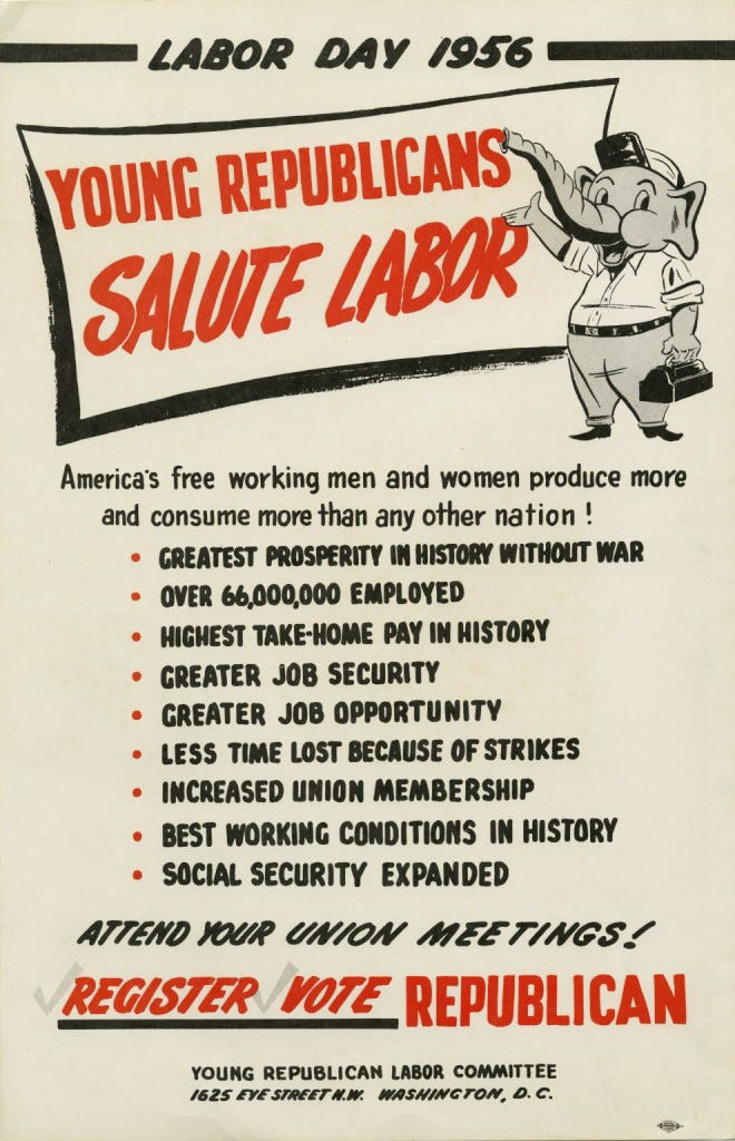 When Ronald Reagan came to power in 1981, the Republican Party was correctly seen — after the GOP’s tax cut and deregulation binges in the 1920s crashed the economy leading to the Republican Great Depression — as pretty much exclusively the party of the rich and powerful, as the party that embraced big corporations and hated organized labor.
